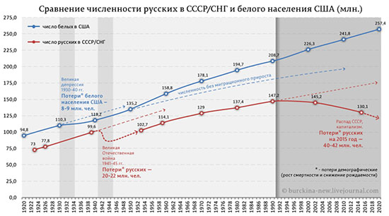 В теме Русский мир. Сумма потерь мне подкинули ценную идею сравнить динамику роста населения СССР с динамикой роста за аналогичный период времени какой-нибудь крупной страны Запада. Я решил сравнить с США, с лидером западного мира, сравнимым с СССР по численности и национальному составу населения – тоже довольно пестрому. Что из этого вышло, вы можете увидеть на уже знакомом графике, куда я наложил линию роста численности народа США. Вышла очень интересная картина: