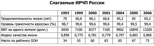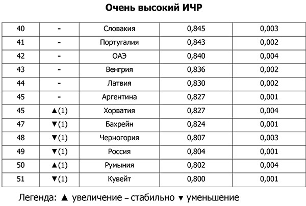 За неполные 15 лет, как видно из приведённых данных, нация откатилась в мировом рейтинге ИРЧП с 34 на 73 место, где и «закрепилась» до сего дня. В 2017 году она занимала 49 место, так и не вернувшись к советскому уровню.