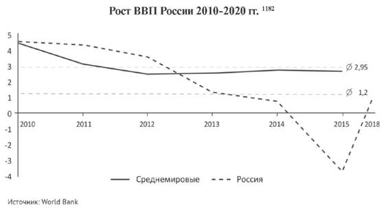 Из графика хорошо видно, что в период 2010–2020 годов рост ВВП России не превышал 1% даже в периоды выхода из кризиса. Короткий промежуток роста экономики 2001–2007 годы и несколько лет после кризиса 2008–2009 годов свидетельствуют только о нестабильности в развитии, хотя именно до 2008 года внешние условия развития были наиболее благоприятны. России так и не удалось создать модели устойчивого развития даже в благоприятных условиях. После обострения МО в 2008 году и резкого ухудшения МО и ВПО после 2014 года Россия оказалась перед проблемой опережающего развития в условиях нарастающего военно-силового противоборства. К такой политике ни институционально (политико-идеологически и организационно), ни морально-психологически её правящая элита оказалась не готова. Ей пришлось срочно, наспех, пересматривать основные планы и формировать Гособоронзаказ на 2010–2020 годы и далее, пытаться освобождаться от внешней импортной зависимости, восстанавливать ОПК, выделяя для этого необходимые ресурсы.