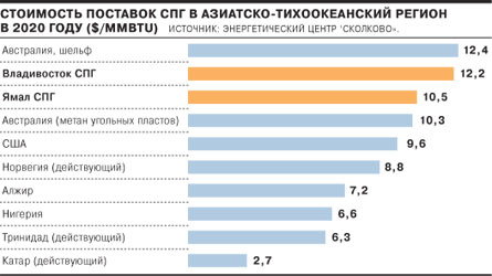 Растущая конкуренция среди мировых поставщиков СПГ как по объемам производства, так и по стоимости на целевых рынках может драматическим образом сказаться на перспективах российских СПГ-проектов. По мнению авторов исследования, вышеперечисленные факторы вкупе с изменениями в ценообразовании (увеличение доли спотовой торговли) могут привести к снижению стоимости СПГ на азиатском рынке до $12 за MMBtu к 2020 году. В настоящее время в России существует единственный завод СПГ в рамках проекта "Сахалин-2", и российские компании в перспективе до 2020 года планируют строительство еще четырех заводов: "Ямал-СПГ" (НОВАТЭК, первая очередь 5,5 млн тонн), "Владивосток-СПГ" ("Газпром", 5 млн тонн), проект "Роснефти" и ExxonMobil на Сахалине (5 млн тонн), а также "Печора-СПГ" (2,6 млн тонн). Из них только продукция завода на Ямале относительно комфортно конкурирует с альтернативными поставщиками на азиатском рынке АТР (см. график). "Понятно, что цена СПГ с завода во Владивостоке с учетом стоимости трубы с месторождений Ковыкты и Чаянды будет верхней границей стоимости российского газа на рынке АТР,- полагает старший аналитик энергетического центра Мария Белова.- Что касается завода "Роснефти", то здесь есть неопределенность как с ресурсной базой, так и со сроками". По ее мнению, "доля России на мировом рынке СПГ к 2020 году, к сожалению, составит в лучшем случае 6% даже с учетом либерализации экспорта".