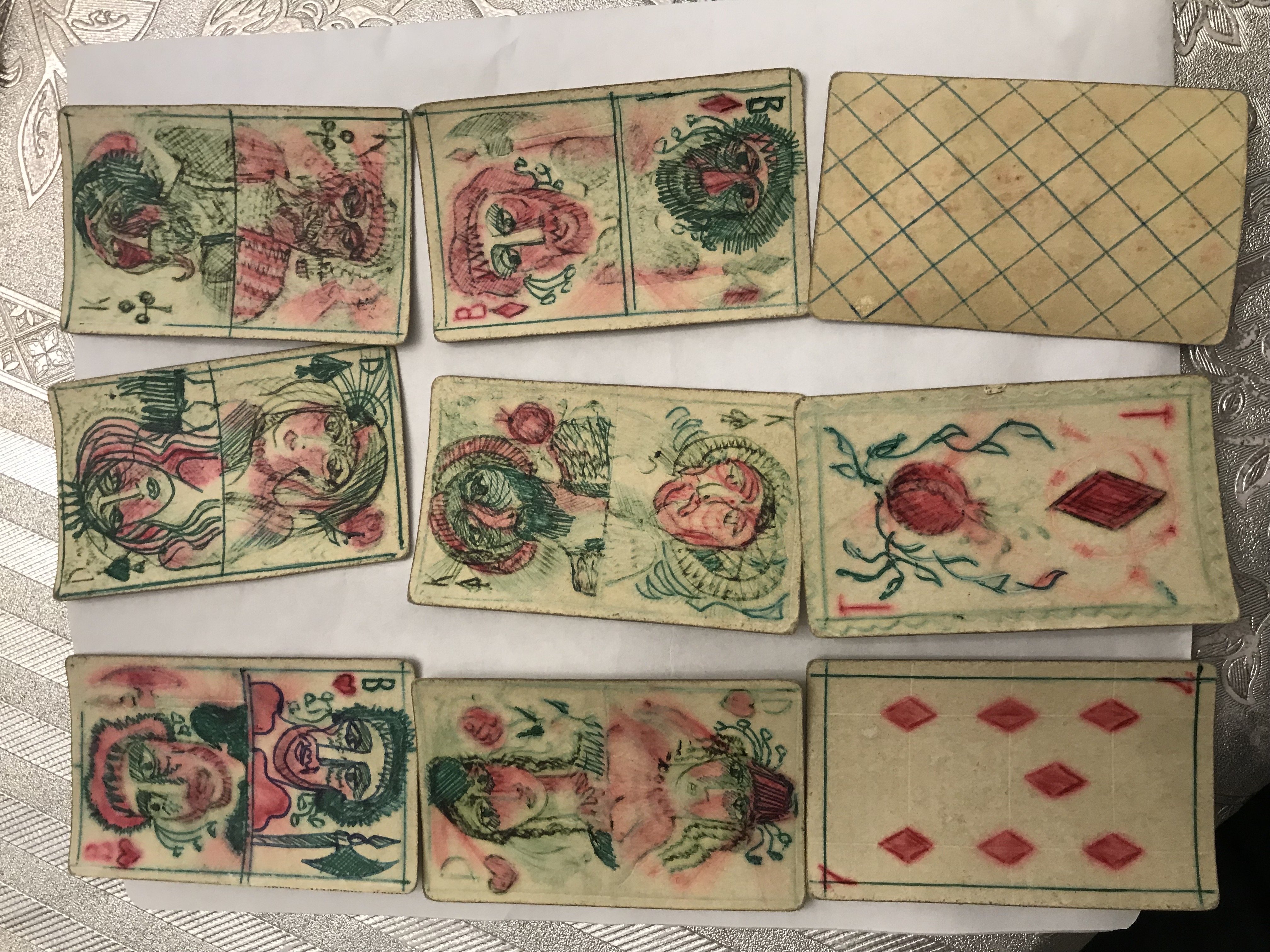 Именно в условиях содержания в камере следственного изолятора, воспользовавшись картонкой из- под, возможно, кускового сахара, и цветных шариковых ручек, им была сделана эта колода игральных карт. И в этом ее уникальность.