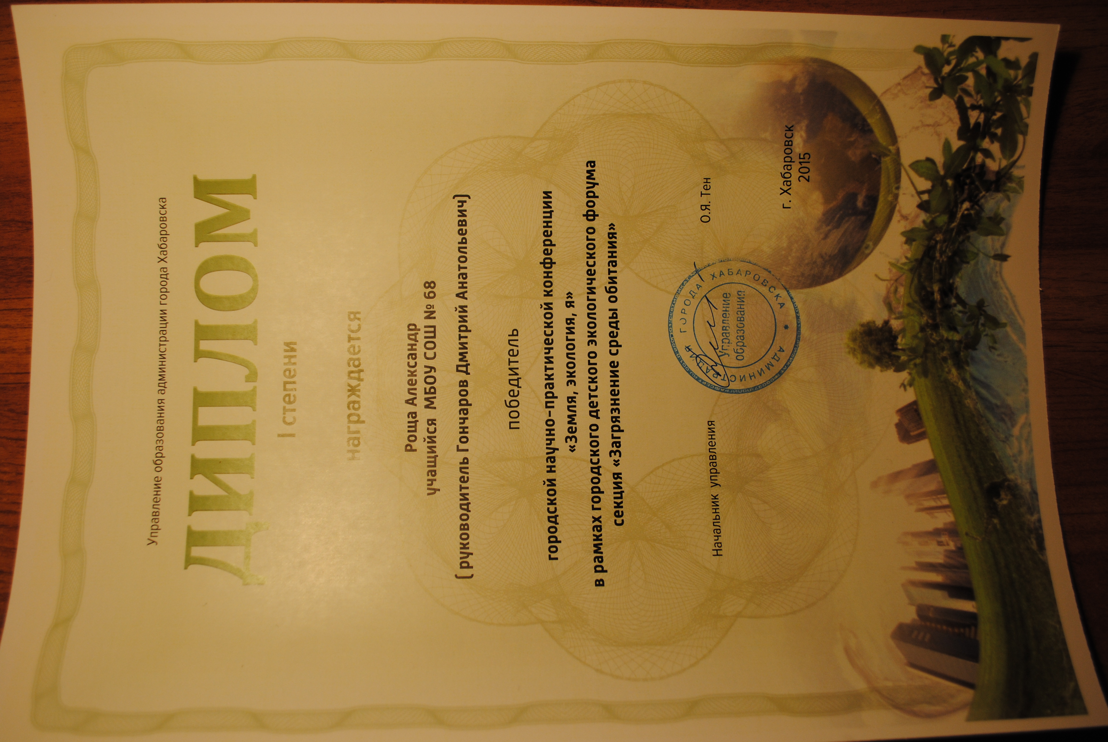 - Ежегодные мероприятия не обходят стороной и факультет довузовского образования Дальневосточного государственного медицинского университета,- говорит преподаватель медицинского университета Дмитрий Анатольевич Гончаров.- Свои научно-исследовательские работы подготовили 4 человека. Они проходят обучение в образовательных организациях города Хабаровска. Среди них Ткаченко Семён из хабаровского военно-морского лицея (10-А класс) выступил с докладом «Меры противоэпидемической профилактики предупреждения и распространения геморрагической лихорадки Эбола в Дальневосточном регионе». А вот ученик 11-Б класса гимназии № 3 Алексей Пашковский отдал предпочтение теме «Биологическая роль спортивного питания». Представитель 10-А класса МБОУ СОШ № 68 Александр Роща провёл исследования на тему «Мы и загрязнение атмосферного воздуха». Все очень внимательно слушали итоги научного исследования «Влияние бытовой техники, ЭВМ и сотовой аппаратуры на здоровье человека» ученицы МБОУ СОШ № 9 из 11-А класса Ветошкиной Василины. Свои доклады в четырёх секциях представили 48 человек. Победителем секции «Загрязнение среды обитания» стал Александр Роща из хабаровской 68 школы. Среди наград Диплом первой степени, медаль и сертификат на 700 рублей. 4 апреля 2015 года. Приложение: 1) Доклад «Мы и загрязнение атмосферного воздуха» на 19 страницах. Автор Александр Роща. 2) Презентация «Мы и загрязнение атмосферного воздуха», 50 слайдов. Автор Александр Роща. Фото автора Хабаровск