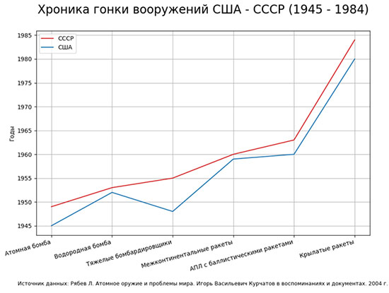 Тем примечательнее кажется опыт военно-технологического соперничества СССР и США в послевоенные годы, когда по всем основным направлениям НТП СССР не отставал, а нередко и опережал США.