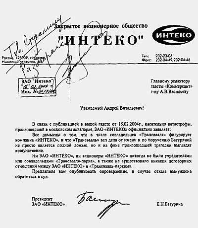 Письмом от 16.02.04. (исх. Nо01-17/110) президент ЗАО `Интеко` Е. Н. Батурина предложила опубликовать опровержение информации о существовании договорных отношений между упомянутым ЗАО и `Трансвааль-парком`. Письмо Nо01-17/110 публикует, но опровержения все равно не получилось