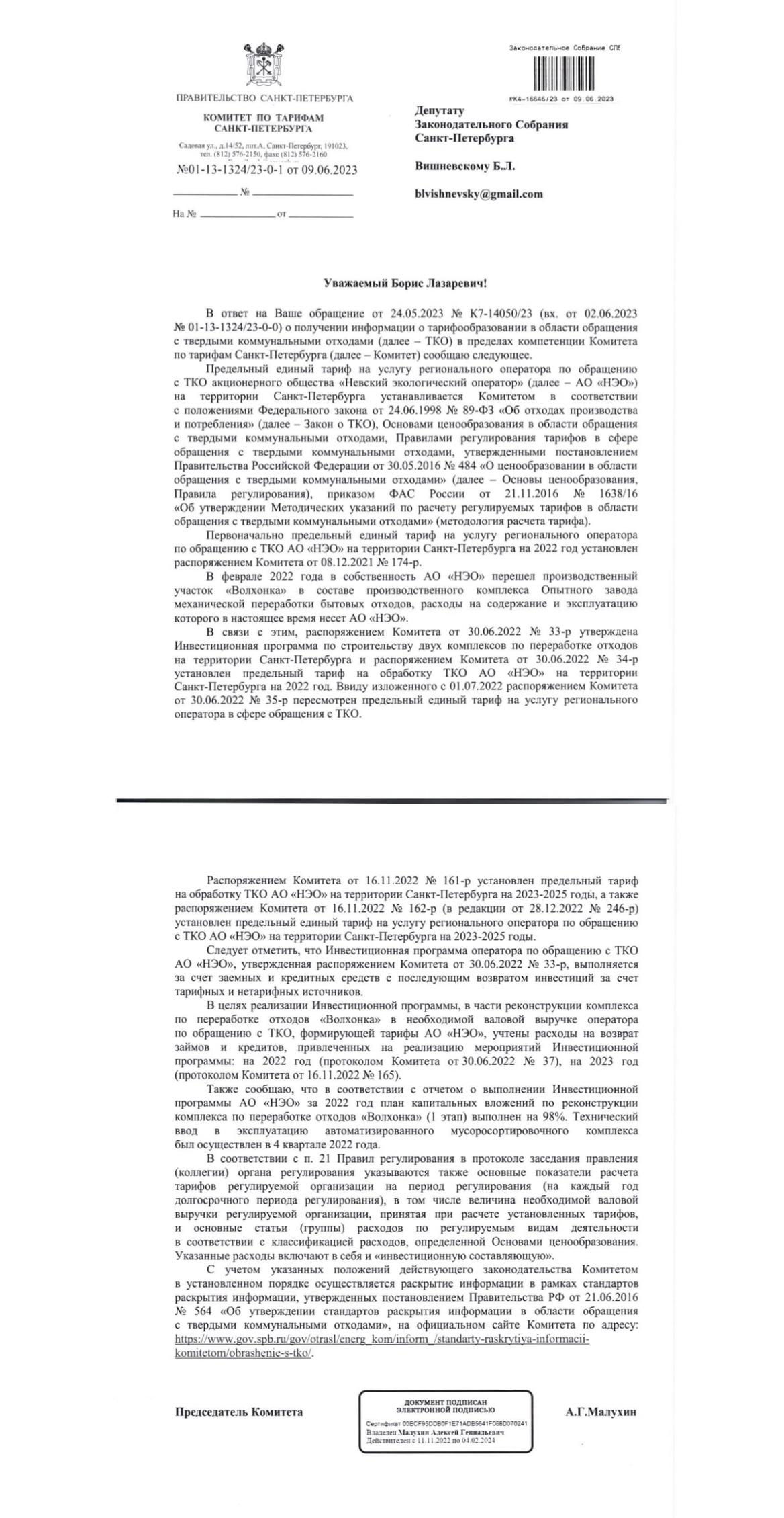 Вместе с тем депутат опубликовал ответ Комитета по тарифам Санкт-Петербурга, в котором сообщается, что в связи с утверждением инвестиционной программы по строительству двух комплексов по переработке отходов на территории Санкт Петербурга был пересмотрен предельный единый тариф на услугу регионального оператора в сфере обращения с ТКО.