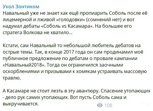 Экс-юрист т.н. Фонда борьбы с коррупцией Виталий Серукановубежден, что Любовь Соболь предложила Валерии Касамарепринять участие в дебатах не по собственной воле, а под давлением своего начальника. Навальный после отсидки в спецприемнике, судя по всему, затосковал по общественному вниманию, но совершенно не понимает, каким образом привлечь внимание к «увядающей» в политическом плане Соболь.