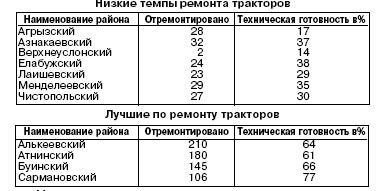 В то же время в некоторых хозяйствах Агрызского, Аксубаевского, Бугульминского, Лениногорского и Новошешминского районов до сих пор по-настоящему не развернули ремонт почвообрабатывающих, посевных и других прицепных машин. Учитывая, что в каждом из хозяйств перечисленных районов имеются помещения для ремонта сельхозмашин, двух-трех тракторов, а также одного зерноуборочного комбайна, трудно понять позицию здешних руководителей и специалистов. Как правило, в тех районах, где до сих пор не организован ремонт, всегда затягиваются сроки весенне-полевых работ.