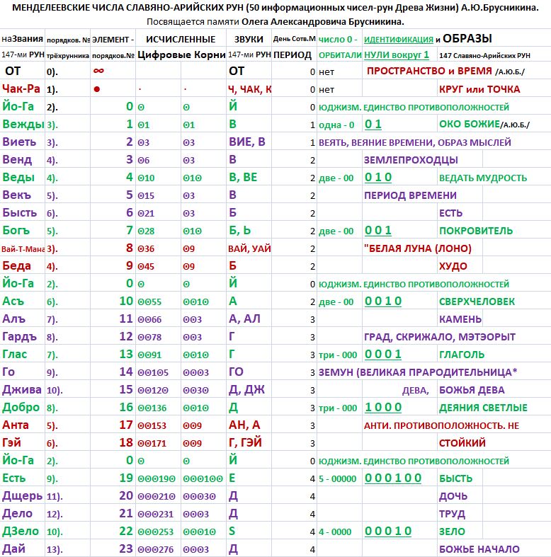 А.Брусникин: Составное десять (10) по древнерусской двукоряди («славянскому плугу») - 01(ʘ1) – информационное число (цифра), как и – НОЛЬ, НУЛЬ, НОУЛЬ (0), и 1 (ОДИН). Авторские /А.Ю.Б./ комплексные расчёты порядковых наЗваний изначального числа ДЕСЯТЬ и производных от него наЗваний чисел: 11-19 (…НАДЦАТЬ), 20-29, 30-39, 50-59, 60-69, 70-79, 80-89 (ДЦАТЬ)… и ЦИФР привожу. Как образец – таблица (Тринадцатая ПРОПУЩЕННАЯ Глава – «МЕНДЕЛЕЕВСКИЕ ЧИСЛА…»).