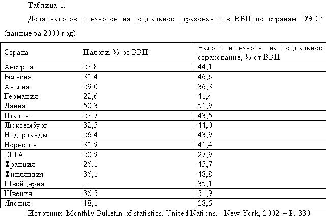 доходами конкретного домохозяйства. Доступ к финансируемым из государственных и муниципальных бюджетов общественным услугам, если и предоставляется с учётом высоты доходов, то в прямо обратной, по сравнению с частными рыночными услугами, зависимости: чем больше доходы домохозяйства, тем меньше оснований его членам рассчитывать на получение услуг в рамках программ для малоимущих. В силу различий в финансовых источниках оплаты частных и общественных услуг налоги фактически представляют собой изъятия из величины частного спроса на услуги. А для общественных услуг, напротив, налоги - это поступления в общественный фонд спроса на них. Формирование доходов от труда, прибыли, добавленной стоимости, и, следовательно, потребление домохозяйств находится под определяющим воздействием национальных различий в ставках налогов и взносов на социальное страхование. Чем выше уровень налогообложения в стране, тем меньше средств остаётся у домохозяйств для оплаты предлагаемых на рынке частных потребительских услуг, отчего доля работников, занятых в их производстве, ниже. Зато высока доля занятых оказанием общественных услуг, поскольку широкомасштабное перераспределение вновь созданной стоимости через налогово-бюджетную систему предполагает значительные объёмы финансирования производства общественных услуг. Аналогичным образом обстоит дело и с межстрановыми различиями в степени дифференциации доходов. Чем больше в стране разрыв в доходах между самыми богатыми и самыми бедными, тем выше доля занятости в производстве частных рыночных услуг. Особенно наглядно это проявляется в слаборазвитых странах, где относительно немногочисленный (5-10% от всего населения) верхний зажиточный слой населения предъявляет значительный по объёму и достаточно разнообразный по составу спрос на частные услуги. Одновременно в таких странах отмечается ощутимое отставание развития сферы общественных услуг. Отследим присутствие указанных связей между уровнем налогообложения, с одной стороны, и изменением соотношения частных рыночных и общественных услуг, с другой, используя сгруппированные в таблицу статистические данные по пятнадцати ведущим странам-членам ОЭСР за 2000 год (см. табл. 1).