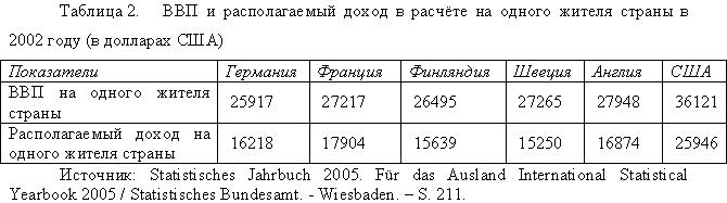 Обращают на себя внимание большие различия между величинами ВВП и располагаемого дохода в расчёте на одного жителя в Финляндии (располагаемый доход составляет 59% от величины ВВП) и в Швеции (55,9%). В то же время в США располагаемый доход на одного жителя составлял 71,8%, во Франции - 65,8%. Самый низкий среди стран ОЭСР уровень налогов и взносов на социальное страхование был в США (27,9%), наиболее высокий - в Швеции и Дании (51,9%), а также в Финляндии (48,8%), чему можно дать следующее объяснение: более масштабное перераспределение созданного продукта через государственные и муниципальные бюджеты уменьшает покупательную способность домохозяйств, что также находит отражение в структуре использования ВВП страны. Согласно данным за 2004 год доля потребления домохозяйств в США достигала 70,1% от величины ВВП, в Германии - 59,1%, во Франции - 56,1%, в то время как в Швеции составила лишь 48,1%. Естественно, такое положение со спросом домохозяйств вполне определённым образом повлияло на структуру произведённого страной валового продукта, в том числе и в секторе услуг. Так, в 2004 году удельный вес нацеленных прежде всего на удовлетворение спроса домохозяйств услуг торговли, гостиничного дела, общественного питания и транспорта в общем объёме предоставленных третичным сектором услуг был равен в Швеции 20,8%, тогда как в Великобритании - 31,9%, в Германии - 25,9%, во Франции - 25,2%.
