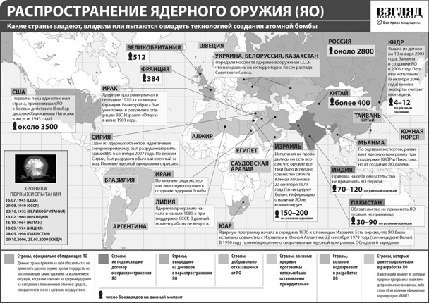 Добавим, что главным международным соглашением по сдерживанию оружия массового поражения в мире считается Договор о нераспространении ядерного оружия (ДНЯО). Согласно документу, государства-участники, не обладающие ядерным оружием, согласились не стремиться его заполучить, а ядерные державы - продолжать избавляться от него. Договор вступил в силу в 1970 году. Но проблема в том, что Индия, Израиль (есть подозрения, что у него тоже есть ядерное оружие) и Пакистан не присоединились к ДНЯО.