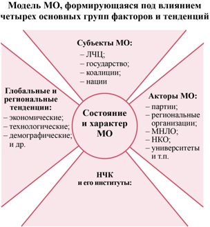 Выше предлагался рисунок, списывающий модель МО, которая формируется из этих групп. В начале этого раздела целесообразно повторить эту модель еще раз с тем, чтобы точнее определить место ЛЧЦ среди других факторов и тенденций МО в Евразии в настоящее время. Как видно из рисунка, ЛЧЦ являются одним из факторов, участвующих в формировании МО, но вопрос в настоящее время заключается в роли и значении именно этого фактора среди прочих факторов.