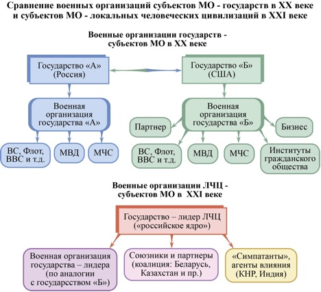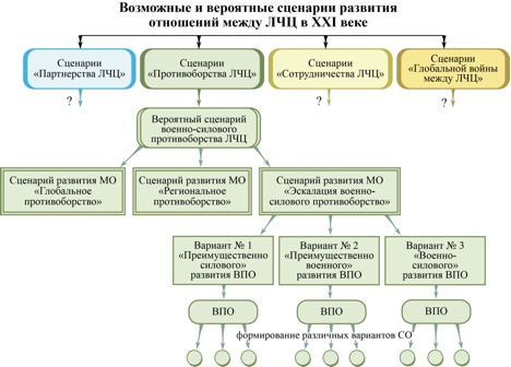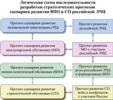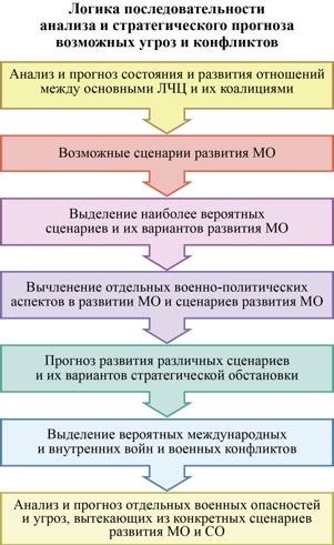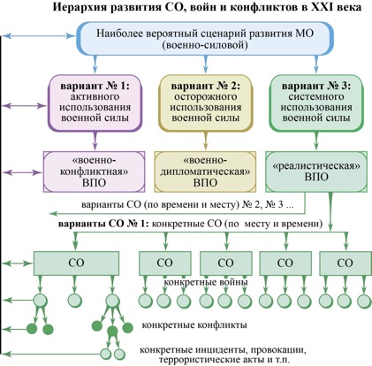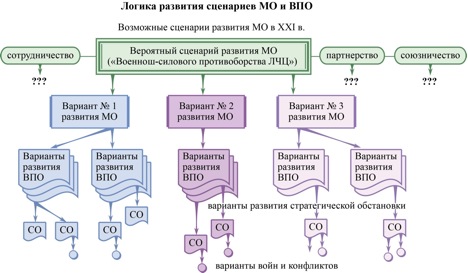 – анализ конкретных военных опасностей и угроз, который присутствует в Стратегии национальной безопасности и Военной доктрине России, предполагает изначально анализ одного из очень конкретных сценариев развития СО. Такой анализ крайне маловероятен, с одной стороны, но абсолютно необходим, – с другой. Это означает, что исключительно много внимания и ресурсов требует анализ и прогноз многочисленных возможных вариантов развития СО, которые можно спрогнозировать только исходя из логики анализа отношений между ЛЧЦ, развития МО и ВПО. Иными словами, в таких фундаментальных документах как Стратегия национальной безопасности или Военная доктрина России, в которых дается анализ угроз и опасностей, начинать надо с анализа отношений между ЛЧЦ, сценариев развития МО и ВПО и только потом переходить к угрозам и опасностям.