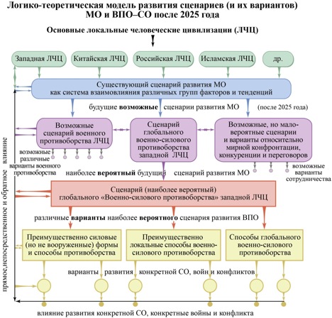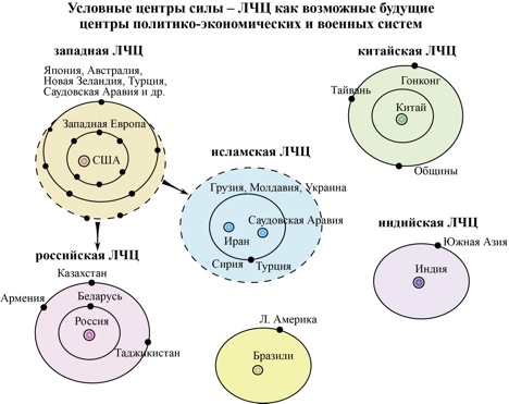 Необходимо сразу же оговориться, что предметом анализа не являются культурно-исторические, политические, философские и иные аспекты развития локальных человеческих цивилизаций (ЛЧЦ), о которых написано достаточно много великими мыслителями от Чаадаева и Данилевского до Тойнби и Хантингтона. В настоящей работе существование ЛЧЦ и их решающее развитие на МО в настоящем и будущем принимается за аксиому и рассматриваются исключительно геополитические и военно-политические последствия взаимодействия и борьбы современных ЛЧЦ, которые, на взгляд автора, стали решающими факторами, влияющими на развитие тех или иных сценариев и их вариантов МО.