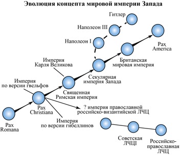 По сути дела именно эти основы западной цивилизации во главе с США составляют «империю западной ЛЧЦ», во многом аналогичную и унаследовавшую черты Римской империи начала новой эры. Цивилизационно, идеологически, политически и с военной точки зрения это означает политическую и военную коалицию стран, входящих в западную ЛЧЦ и ряд зависимых государств, которая выступает механизмом продвижения системы ценностей и интересов всей ЛЧЦ, возглавляемой США.