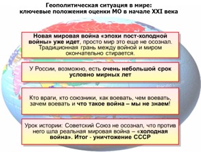 Современная международная обстановка (МО), формируемая, как уже говорилось, под влиянием четырех групп факторов и тенденций, становится все более зависимой от цивилизационных и межцивилизационных отношений, без которых невозможно понять не только отношения между государствами (например, России и США, и стран ЕС), но и негосударственными акторами (инциденты в спортивном сообществе, отношения с экстремистскими, националистическими организациями). Выступая на съезде Демократической партии США в числе 2016 года Б. Обама по этому поводу заметил: «Россия и США никогда не перестанут быть геополитическими противниками».