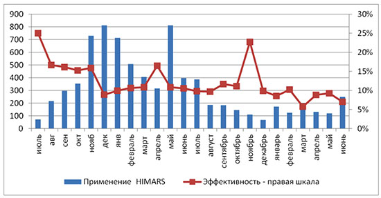 С точки зрения применения артиллерии и ВТО: если сравнивать, например с августом-декабрем 2022 года (в среднем 65 попаданий/месяц), то в июне 2024 года совсем мало.