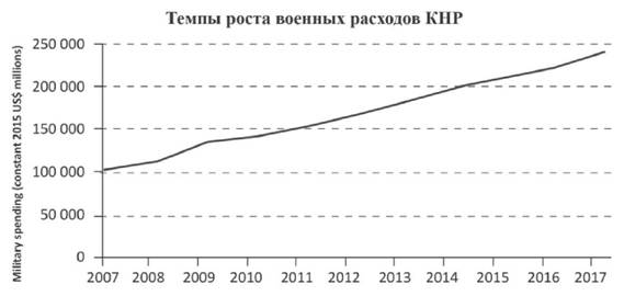 Можно привести два примера быстрого и медленного роста военных расходов в КНР и в странах Западной Европы до 2018 года. Как видно на первом графике, эти расходы КНР выросли за 2007-2017 гг. (т.е. за 10 лет) более чем в 2 раза и сделали Китай безусловным лидером (после США) в мире.
