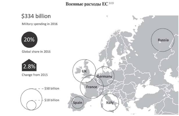 За этот же период военные расходы стран ЕС росли темпами менее 3%, но в целом их объем увеличился до более чем 350 млрд долл. в 2017 году. Если продлить эту тенденцию и допустить, что усилия Д. Трампа не дадут весомых результатов, то все равно, к 2024 году военные расходы стран Евросоюза вырастут, как минимум, на 25% и составят не менее 450 млрд долл., но скорее всего (и не только под давлением США) они могут превышать 500 млрд долл.