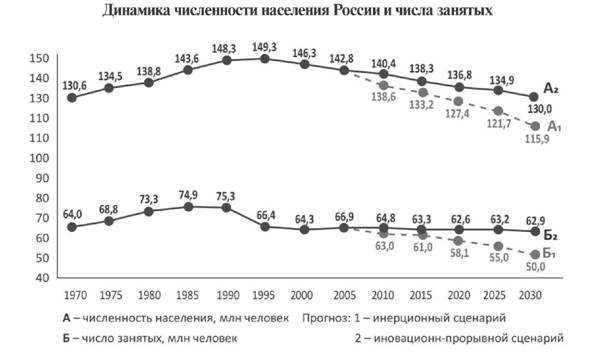 Очень важно отметить в этой связи хроническую недооценку возможностей демографического развития России, которая периодически происходит не только за рубежом, в международных организациях, так и у нас в стране. Так, после демографической катастрофы 90-х годов XX века любой долгосрочный прогноз относительно России был либо пессимистичным, либо крайне пессимистичным. Это вело к явной недооценки роли субъективного фактора, прежде всего, усилий руководства страны по стимулированию роста демографического потенциала. Так, на рубеже конца прошлого и в начале XXI века наиболее часто встречавшийся и, как говорилось, «реалистический» прогноз демографической ситуации в стране представлял собой следующую картину.