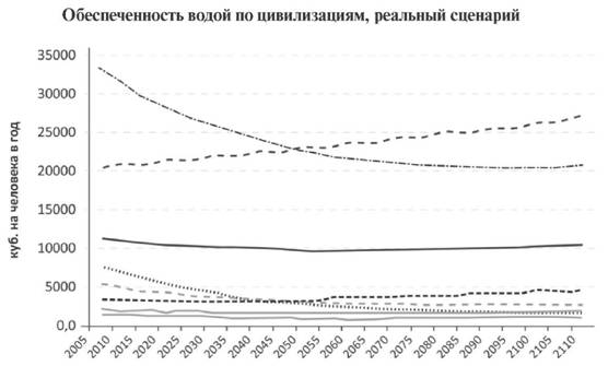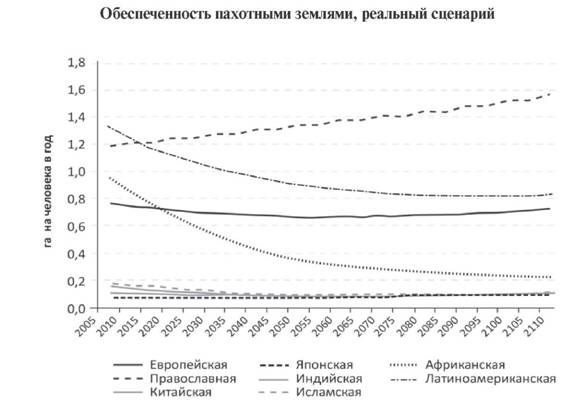 Вместе с тем в развитии участвуют и более фундаментальные факторы, чьё наличие или отсутствие предопределяет само будущее ЛЧЦ. Например, пресная вода, плодородная почва и другие ресурсы, которым либеральные экономисты нередко не уделяют должного внимания. По сочетанию душевой обеспеченности пахотной землей и пресной водой – двумя основными факторами ведения сельского хозяйства – можно выделить две основные группы цивилизаций. Первая группа обеспечена обоими факторами сельскохозяйственного производства. Это европейская, православная и латиноамериканская цивилизации. И земли и воды у них достаточно, чтобы развивать сельское хозяйство.