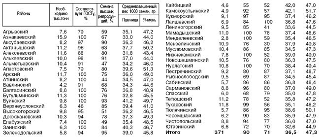 Наиболее полновесные и выровненные семена подготовлены в Буинском, Камскоустьинском, Заинском, Апастовском, Актанышском и Тюлячинском районах. К примеру, вес 1000 семян в ООО "Дружба" Буинского района по партиям яровой пшеницы составляет 46,5 грамма, по ячменю - 54 грамма, такие же партии подготовлены в хозяйствах в ООО "Тамыр" и "Нур" Актанышского района, СХПК "Арбор" Балтасинского района и ряде других хозяйств. С такими семенами можно быть уверенным в получении высоких урожаев.