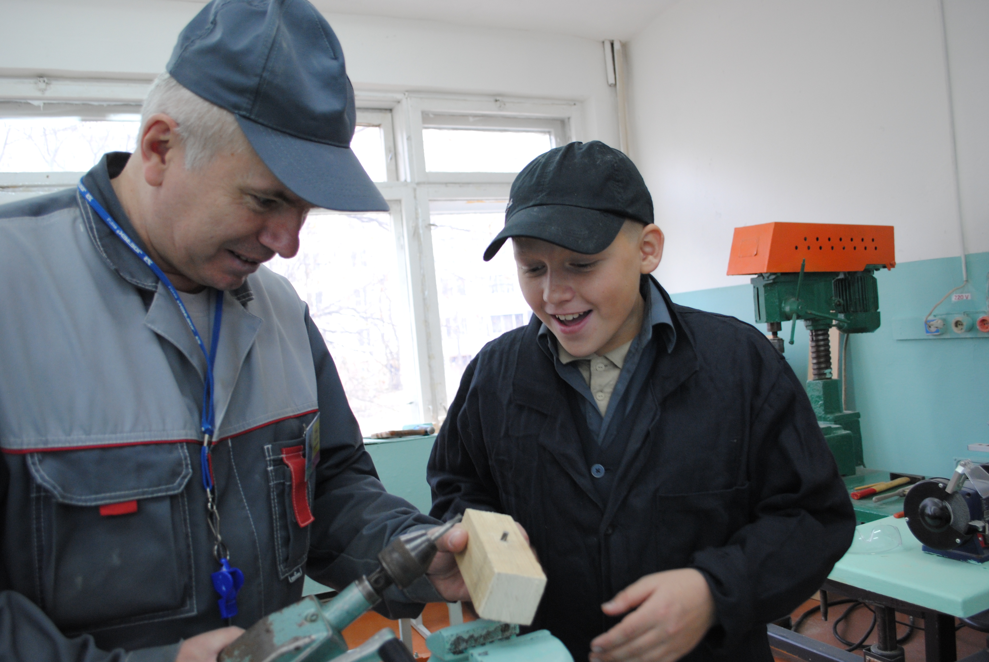 Сергей Роща. В третьих, технологическая теория, письменный ответ. На третьей неделе каждой четверти необходимо ответить письменно на 10 вопросов, при этом один балл получат те, кто ответит правильно, то есть, напишет, а не угадает, минимум на восемь вопросов. Всё это называется формированием инженерной мысли на бумаге. Здесь межпредметная связь русский язык, можно на английском, или любом другом иностранном языке. В четвёртых, технологическая практика. Четвёртый балл, и только при наличии рабочей формы одежды: халат, головной убор, защитные очки, ученики будут допущены к выполнению практических заданий по технологической карте, например, изготовление шкатулки на токарных станках СТД-120М и ТВ-6, куда входят и подготовительные работы разметки, пиления, строгания, сверления и так далее. На этом этапе, все остальные уроки, мальчики осваивают рабочие профессии. Именно на этом этапе и формируются основные знания, умения, навыки и компетенции, ученики сами определяют важность других предметов обучения, а это черчение, математика, физика, химия, биология и так далее, в зависимости от первых шагов выбора будущей профессии. И в завершение, в пятых, один балл за тетрадь с записями уроков, домашних заданий, сообщений. Здесь формируется умение работать с технической литературой. Таким образом, сдал пять направлений, и получил свою пятёрочку. Скажу сразу, пока всё это создаётся с учётом школьных возможностей, в процессе разработки методом проб и ошибок.