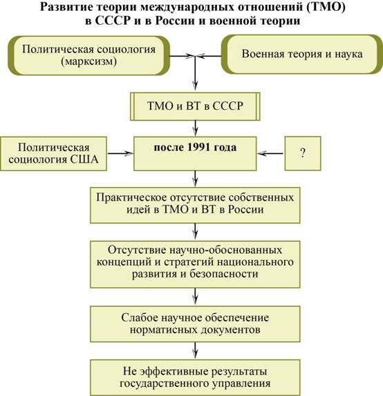 В этом, ограниченно-застывшем теоретическом пространстве МО и ВПО должна развиваться теория международных отношений (ТМО) и военная теория (ВТ), вынужденные существовать в отрыве от сколько-нибудь законченной политической концепции. В самом упрощенном виде ситуация может быть представлена следующим образом.