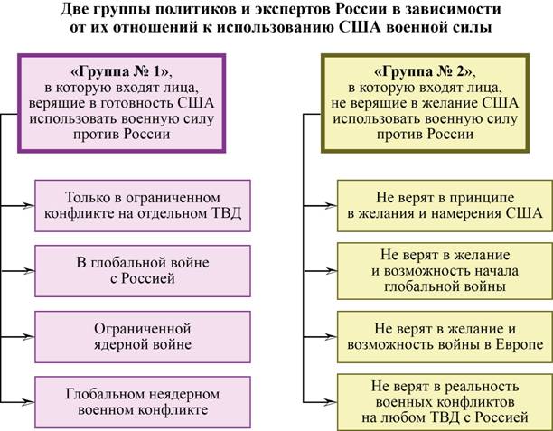 В России, надо признать сложилось две группы политиков и экспертов, которые в зависимости от своих субъективных ощущений («веры») относятся как к США, так и их готовности использовать военную силу. При этом внутри таких групп происходит деление по основным признаком применения оружия.