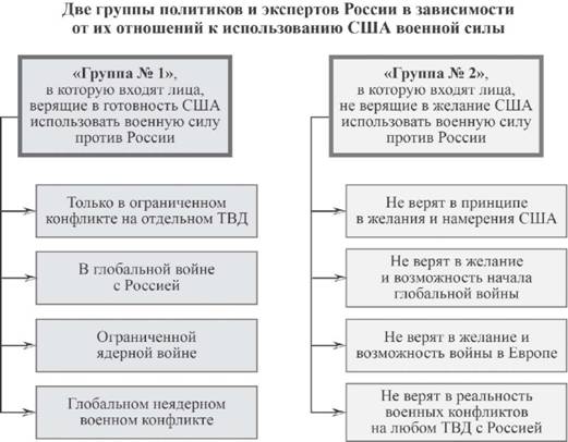В России, надо признать сложилось две группы политиков и экспертов, которые в зависимости от своих субъективных ощущений («веры») относятся как к США, так и их готовности использовать военную силу. При этом внутри таких групп происходит деление по основным признаком применения оружия.