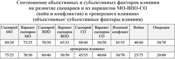 Иными словами, зависимость от субъективных факторов при развитии сценария МО и его превращения в конкретный вариант ВПО (или, тем более, военного конфликта или операции) нарастает от состояния «влиятельного» значения (МО) в «доминирующее» (ВПО) и «решающее (СО).