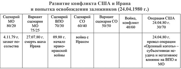 Как видно из предлагаемой логики и оценки развития ВПО, в нем огромное значение имел субъективный фактор (захват посольства, смерть шаха, начало ирано-иракского конфликта и т. д.). И, наоборот, «реверс» – субъективный провал операции «Орлиный коготь» – крайне негативно повлиял для политики США и в целом на развитие ВПО и МО в регионе, которые стали меняться только (с 27.07.80 г.) со смертью шаха и началом войны (09.1980 г.) с Ираком.