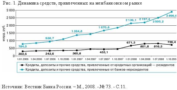 В последнее время усиливается роль иностранного капитала в российском банковском секторе. Так, по данным ЦБ РФ, на 1 октября 2008 г. количество контролируемых нерезидентами банков составило 98, увеличившись с начала года на 12 банков. Доля нерезидентов в капитале российской банковской системы составляет 25,1%. Удельный вес привлеченных ими вкладов физических лиц в общем объеме вкладов физических лиц увеличился с 8,9% (на 1.01.2008 г.) до 9,3% (на 1.10.2008 г.). С января по октябрь 2008 г. доля контролируемых нерезидентами банков в общем объеме средств, привлеченных банковским сектором, увеличилась с 17,8 до 18,0%. В целом расширение деятельности иностранных банков на территории РФ оценивается как положительный фактор, дающий развивающейся отечественной экономике дополнительные финансовые возможности. Это подтверждают официальные статистические данные. На долю кредитов нефинансовым организациям, предоставленных банками, контролируемыми нерезидентами, на 1.10.2008 г. приходилось 17,0% от объема данных кредитов, предоставленных банковским сектором в целом (на 1.01.2008 - 15,5%). Особенно заметна их роль на рынке межбанковских кредитов - 29,1%. (1) Объем чистых заимствований российских кредитных организаций у банков-нерезидентов на рынке МБК увеличился с 1284,6 млрд. руб. на 1.01.2008 до 1344,1 млрд. руб. на 1.10.2008, или на 4,6%. За последние 3 года этот рост еще более заметен (см. приложение)
