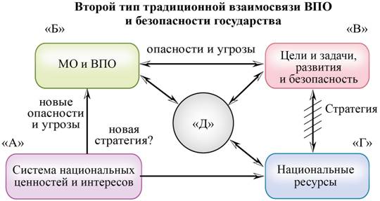 Кроме того, следует принимать во внимание и одну универсальную особенность, характерную для последних двух десятилетий по отношению ко всем участникам МО: классический вариант безопасности субъектов МО-ВПО – эффективная военно-политическая стратегия (вектор «Г»–«В»), обеспечившая достижение политических целей, сменился в XXI веке на необходимость приоритетного обеспечения безопасности системы национальных ценностей (блок «А» и вектор «А»–«Б») Это выводит традиционную стратегию на качественно новый уровень, когда приоритетом становится не только политическая победа и уничтожение военной организации государства, а ликвидация её системы ценностей, того, что относится к цивилизационной основе нации[12]: