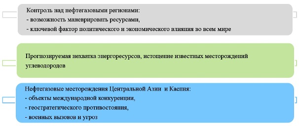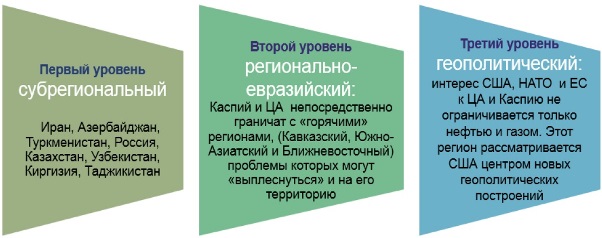 Находясь на стыке трех геостратегических частей мира — Европы, Азии и Ближнего Востока, Центральной Азии (ЦА) и вплотную примыкающие к нему нефтяные и газовые месторождения Каспия превратились в объект международной конкуренции, геостратегического противостояния, военных вызовов и угроз, обусловленных устремлениями ведущих стран мира и межгосударственных союзов к нефтегазовым ресурсам региона. Можно выделить четыре уровня интересов к этому региону (Рис. 3):