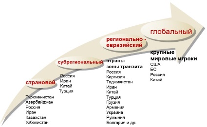 3) регионально — евразийский — страны зоны транзита (Россия, Киргизия, Таджикистан, Иран, Китай, Турция, Грузия, Армения, Украина, Румыния, Болгария и другие), которые пытаются извлечь дивиденды из транспортировки энергосырья по их территории;