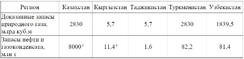Таблица 1. Подтвержденные запасы природного газа, нефти и газоконденсата в Центральной Азии[1]