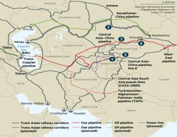 2) строящиеся трубопроводы: четвертая очередь газопровода Туркменистан — Узбекистан — Казахстан Китай, Туркменистан Кыргызстан — Таджикистан — Китай;