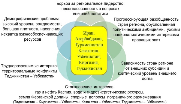 — столкновение национальных, экономических интересов: газ и нефть Каспия, вода и гидроэнергетические ресурсы[8], земля Ферганской долины — спорные вопросы пограничного размежевания (Таджикистан — Кыргызстан — Узбекистан[9], Казахстан — Узбекистан [8], Таджикистан — Узбекистан[10]);