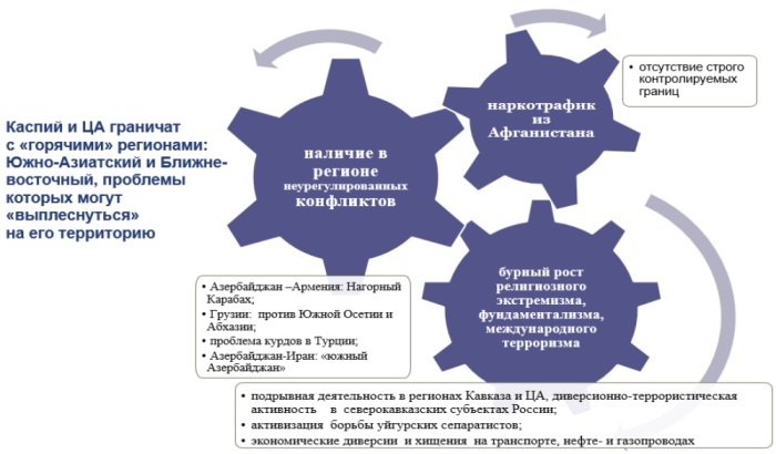 Второй уровень — региональный: Каспий и регион ЦА непосредственно граничат с «горячими» регионами, такими как Кавказский, Южно-Азиатский и Ближневосточный, проблемы которых могут при неблагоприятном стечении обстоятельств «выплеснуться» и на его территорию (Рис. 7).