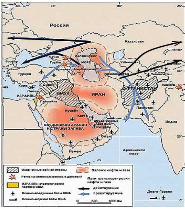 Третии уровень — геополитический: интерес США, HATO и Евросоюза к ЦА и Каспию не ограничивается только нефтью и газом. Этот регион рассматривается США центром геополитических построений, одним из которых является «Стратегический энергетический эллипс» (Рис. 8), охватывающий Каспийское море и Персидский залив, т.е. углеводороды стран Аравийского полуострова, Ирака, Ирана, Каспийского региона, Центральной Азии и даже России.