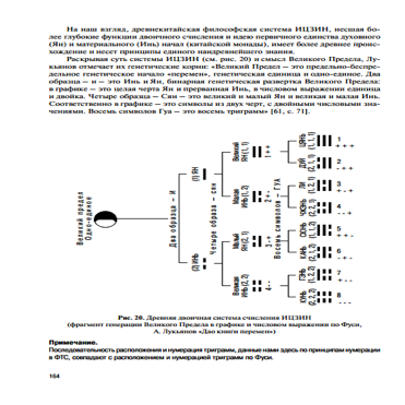 *) Из единственно сохранившегося правила формирования черт диаграмм ... из монограмм "новая черта накладывается сверху старой" нами сделано дополнение - введена ось симметрии генодрева. На ур. монограмм выше оси симметрии располагаются положительные черты (ян), ниже - отрицательные (инь). Т.о., на ур. 4-х диаграмм (см. ниже Рис 2/34) сверху оси должны располагаться вел ян (++) и мал ян (-+), а снизу мал инь (+-) и вел инь (--). У всех авторов гадательных систем выше оси- вел ян и мал инь, ниже- мал ян и вел инь (см. Рис 1/20). В обычных табличной или круговой схем элементов ИЦЗИНа эта тонкость процесса развития не отражается. На Рис 1/20 это правило симметрии нарушается для средних диаграмм и связей триграмм, положение диаграмм, триграмм по Фу Си и Вэнь-Вану отвечает структуре генодрева. Различается с Фу Си ([4] Рис 26); и Вэнь Ваном ([4] Рис 29) только порядок взаимодействия элементов.