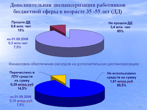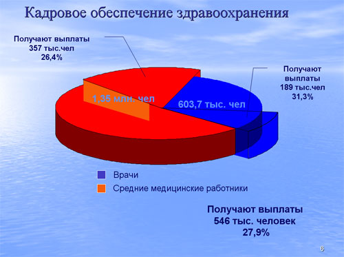 Количество медицинских специалистов, работающих в первичном звене здравоохранения, и "специалистов" одинаково. Однако в некоторых медицинских учреждениях плохо организована работа по проведению диспансеризации, подчеркнул министр. И в результате деньги, предусмотренные на данные цели, вместо того чтобы укрепить бюджет врачей-специалистов, лежат на счетах территориальных отделений Фонда обязательного медицинского страхования (ФОМС) РФ или Фонда социального страхования (ФСС) РФ.