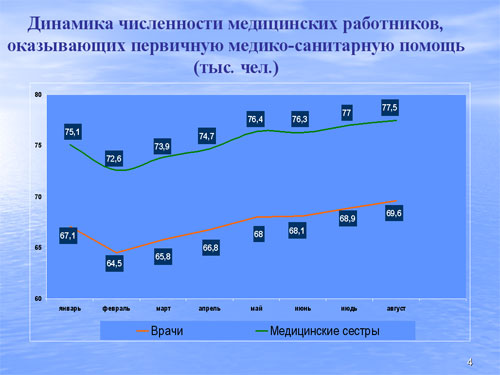 Результатом повышения оплаты труда стал приток кадров в первичное звено здравоохранения. Коэффициент совместительства, который является одним из основных показателей качества работы врачей, снизился с 1,6 в начале года до 1,4 в июле. По прогнозам министерства, при сохранении такой положительной динамики численности медицинских работников, оказывающих первичную медико-санитарную помощь, коэффициент совместительства в 2007 году составит 1,2, а в 2008 году - 1,1.