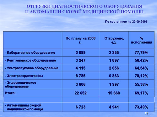 В соответствии с графиком поставок в текущем году регионы России должны получить 22 652 единицы диагностического оборудования на общую сумму 14,297 млрд руб. и 6723 единицы автомобилей "скорой помощи" на общую сумму 3,457 млрд руб.