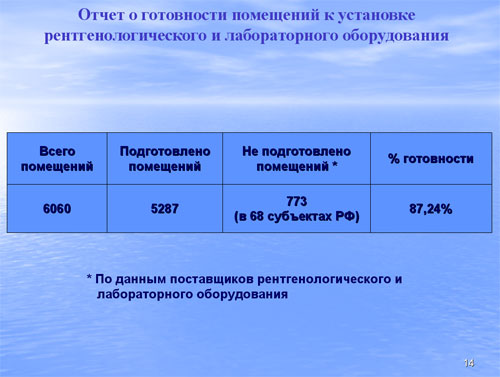 Единственная проблема, с которой сталкиваются поставщики, - это отсутствие в амбулаторно-поликлинических учреждениях подготовленных к установке рентгенологического и лабораторного оборудования помещений. Заместитель министра напомнил, что руководителям субъектов РФ было поручено до 1 октября завершить все работы по подготовке помещений, в противном случае будут рассматриваться варианты перераспределения диагностического оборудования в те субъекты федерации, которые готовы его принять.