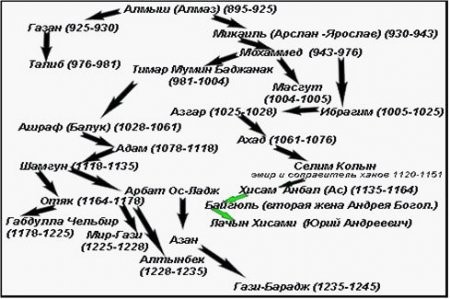 Первый шаг на пути раскола империи гуннов сделали сыновья Куврата – Аспарух и Бат-Боян. В результате их войны произошло отделение западных провинций, и образовалось такое государство как Хазария. Следующий шаг сделали сыновья Авара. Собственно в этот момент и произошло отделение Булгара от империи гуннов. И судя по прозвищу первого правителя Булгара именно потомок Авара принял мусульманство, пытаясь объединиться с династией Джелалатдинов. Иноверцам никто своих принцесс в жены не отдавал. Ну и самый главный шаг к расколу сделал сын Караджара – Айдар, когда принял мусульманство. Судя по всему он это сделал по дипломатическим соображениям, пытаясь вернут в свою империю Булгар. А в результате Булгар получил полную автономию, на территории которой организовалась новая династия потомков Олмоша –Алмыша. Их права на правление могло распростаняться только на Булгар. Джилки был сыном второй жены, поэтому их притязания на власть в Киеве были весьма сомнительны. Именно это привело к многочисленным переворотам и к борьбе за власть на киевских землях. Факт принятия мусульманства Айдаром и вычеркнула и его, и всю эту династическую таблицу из русских летописей. У православной Руси не может быть мусульманских князей! Угыр Лачин – это наш летописный князь Игорь, регентом при котором был летописный варяг Олег. Лачин (Рюрик) – старший сын Айдара, который в это время управлял западными провинциями Булгара. Одна из жен Айдара была из племени ругов. Женой Игоря стала княжна Ольга, и ее сын Святослав стал вторым официальным князем Киева по нашим летописям. Князь Владимир был младшим сыном Святослава. Заслуживает внимание и наш летописный князь древлян Мал, который оказывается был младшим сыном Олмоша, был в свое время хаканом всей Хазарии, стал отцом нашего летописного Добрыни, и матери Владимира – Малоши. И он как полноправный правитель Хазарии на законных основаниях убил Игоря, когда тот попытался наложить на него дань. Святослав стал его приемным сыном. По булгарским летописям, дабы лишить Святослава прав на включение Булгара в состав Руси, он считается внуком Аскольда, т.е. Ольга (анатышка- датчанка) по булгарским летописям была женой сына Аскольда Худа, и только после его смерти стала женой Игоря. Судя по всему главным вдохновителем разгрома Хазарии Святославом был ее бывший хакан Мал. Но в виду сомнительных династических прав на правление в Булгаре, плюс к этому другое вероисповедание Святослава лишили юридических оснований считаться законным правителем Булгара, как и всех его потомков. И в качестве наглядной картины смены династий в Булгаре приводится династическая таблица.