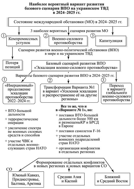 В феврале-марте 2024 года в работе была предложена схема наиболее вероятного развития сценария ВПО и наиболее вероятных его конкретных вариантов в 2024-2025 годах, которая актуальна и в настоящее время. В частности, наиболее вероятным базовым сценарием развития ВПО был указан сценарий «Эскалации военно-силового превосходства» в нескольких наиболее вероятных вариантах, из которых до осени 2024 года очевидно реализовывался «Вариант №1» - «Инерционное продолжение развитие эскалации». Его основные особенности также подтвердились (поставки ВТО, террористические операции и пр.). При этом была заметна и тенденция перехода к «Варианту №2» - «Усиление эскалации и распространение её на другие регионы».