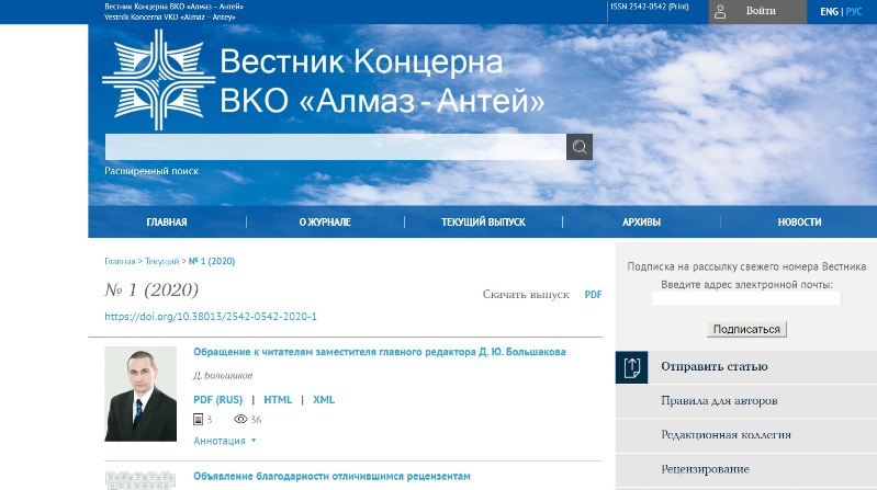 Научно-технический журнал «Вестник Концерна ВКО "Алмаз - Антей"» обрёл новый сайт