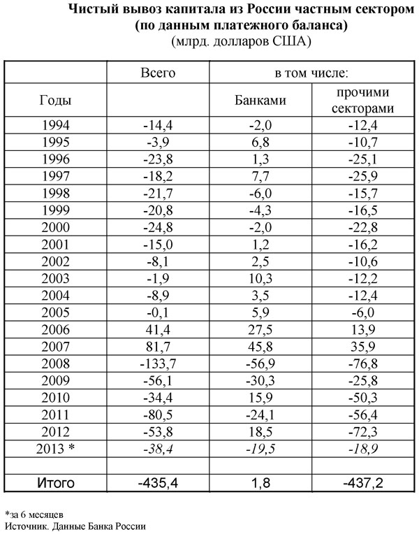 Чистый отток капитала из России в 2012 г. составил 53,8 млрд. долл, из них по словам бывшего председателя ЦБ Сергея Игнатьева "сомнительные операции" - составили 49 млрд. долл. Таким образом, до 70% утекших из России денег было вывезено незаконно.